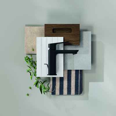 GROHE Cubeo im modernen und zugleich zeitlosen Matt Black – eine gegen Korrosion, Verblassen und Kratzer beständige Pulverbeschichtung – harmoniert mit der bräunlichen Nuance Rubber, dunkleren Hölzern wie Walnuss oder braun getönter Eiche und hellen Fliesen. Zum raffinierten, kontrastreichen Ambiente passen Accessoires aus Naturfasern oder mit auffälligen Mustern.