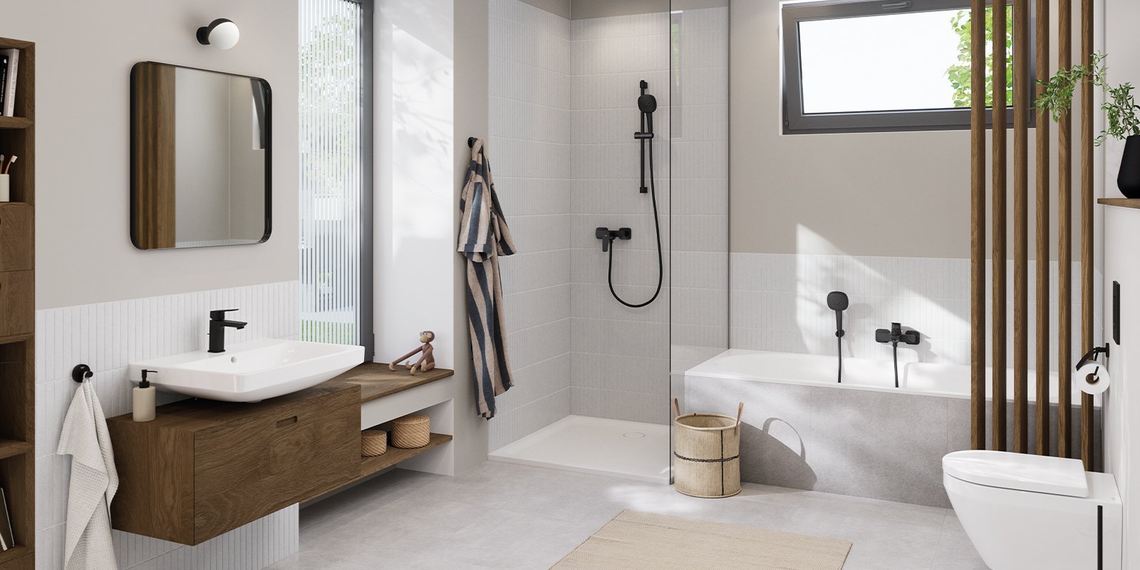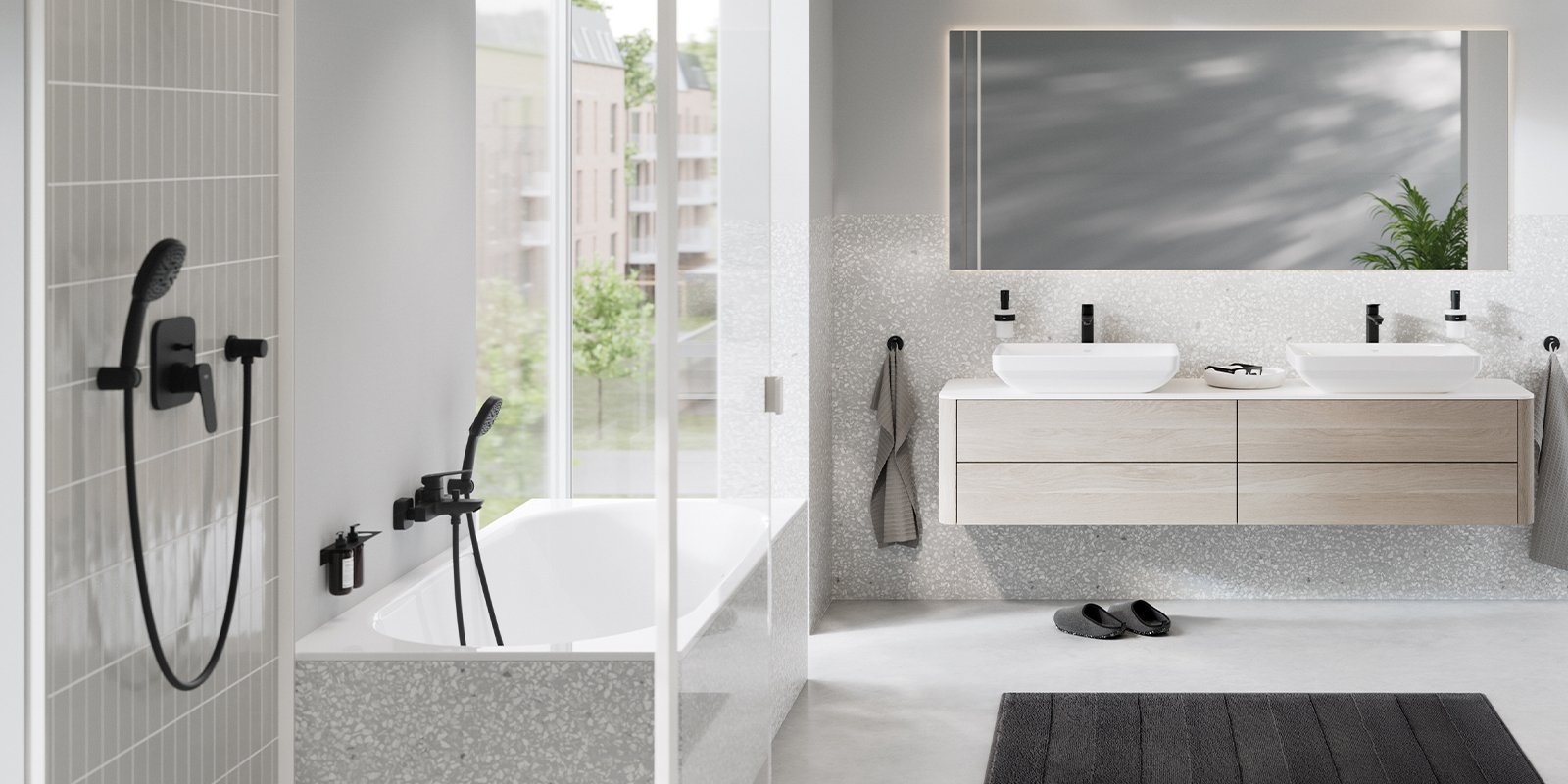 GROHE Cubeo im modernen und zugleich zeitlosen Matt Black – eine gegen Korrosion, Verblassen und Kratzer beständige Pulverbeschichtung – harmoniert mit der bräunlichen Nuance Rubber, dunkleren Hölzern wie Walnuss oder braun getönter Eiche und hellen Fliesen. Zum raffinierten, kontrastreichen Ambiente passen Accessoires aus Naturfasern oder mit auffälligen Mustern.