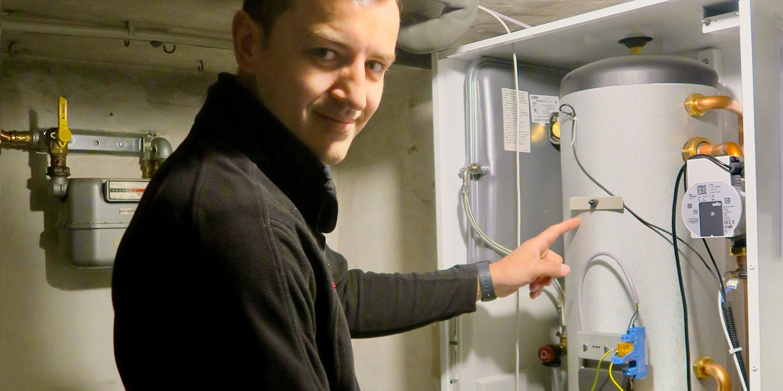 Auf der linken Seite im Heizungskeller befinden sich die Warmwasserverteilung und der 200 l-Warmwasserspeicher BRÖTJE EAS 200.